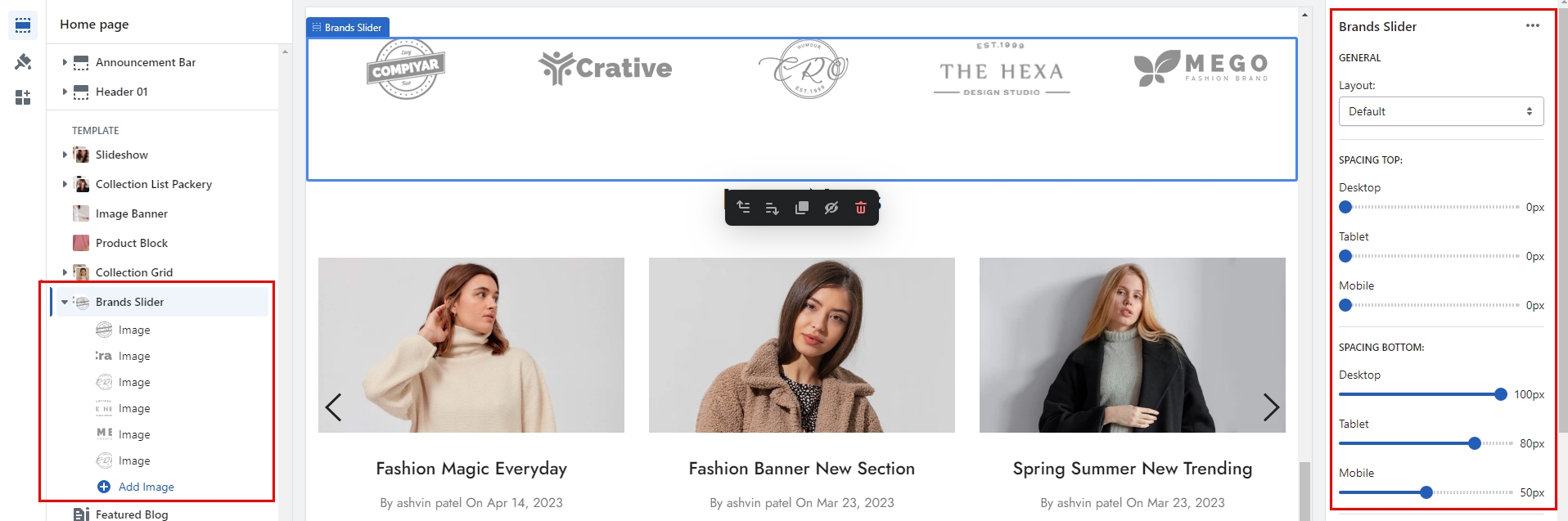 Select the layout width of the whole section. The options are: Default (same as the body width), Full Width (the 100% of the viewport width).
