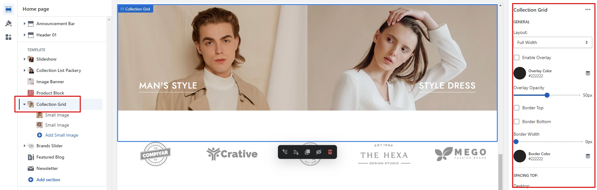 Select the layout width of the whole section. The options are: Default (same as the body width), Full Width (the 100% of the viewport width).