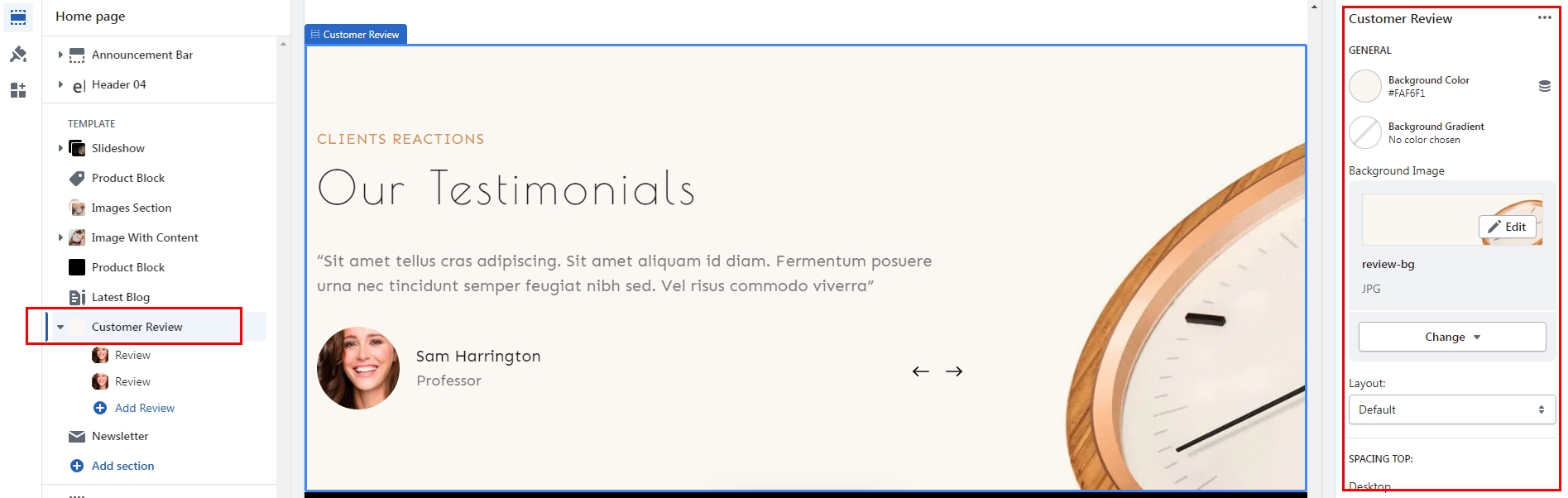 Click Add section and choose "Customer Review".