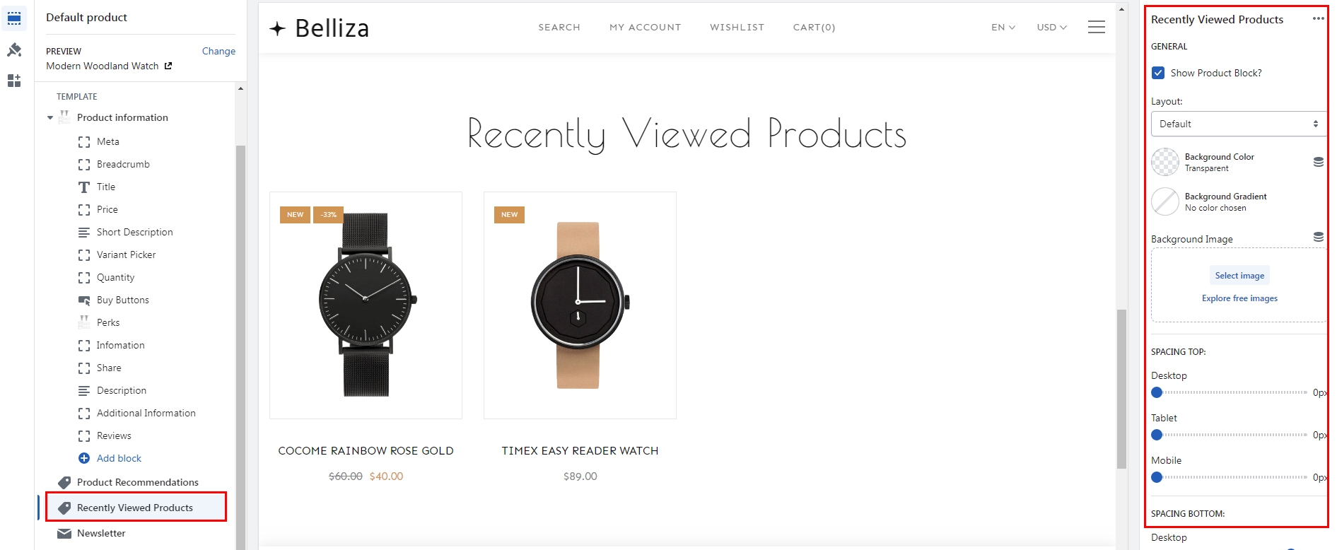 Select the layout width of the whole section. The options are: Default (same as the body width), Full Width (the 100% of the viewport width).